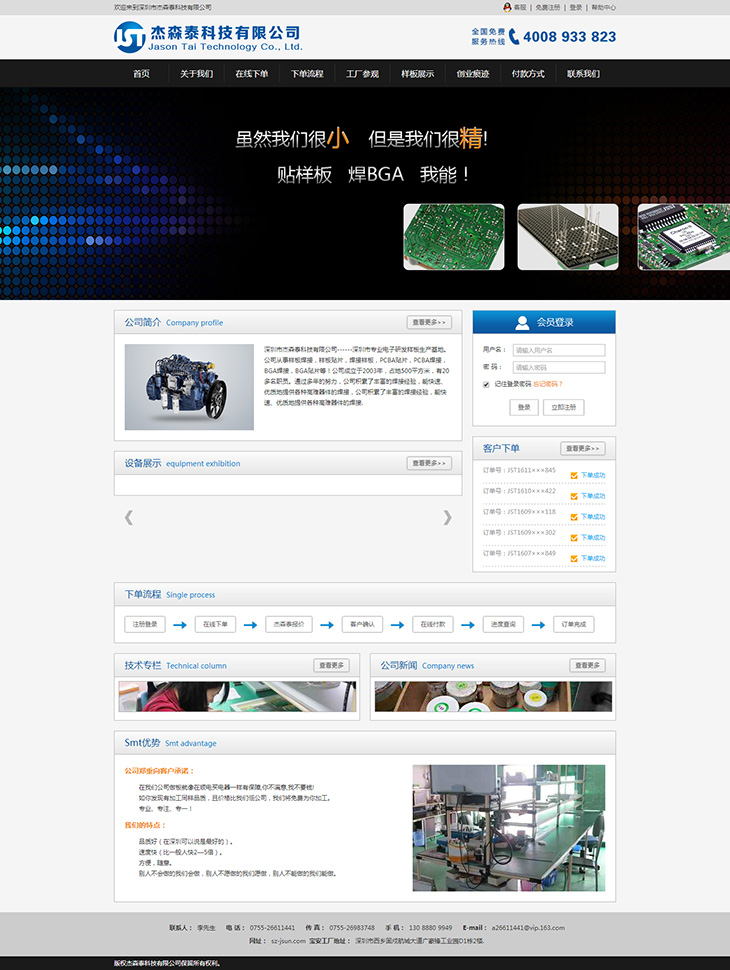 | 项目需求概况: | 公司介绍 深圳市杰森泰科技有限公司------深圳市专业电子研发样板生产基地。公司从事样板焊接,样板贴片,焊接样板,PCBA贴片,PCBA焊接,BGA焊接,BGA贴片等!公司成立于2003年,占地500平方 |