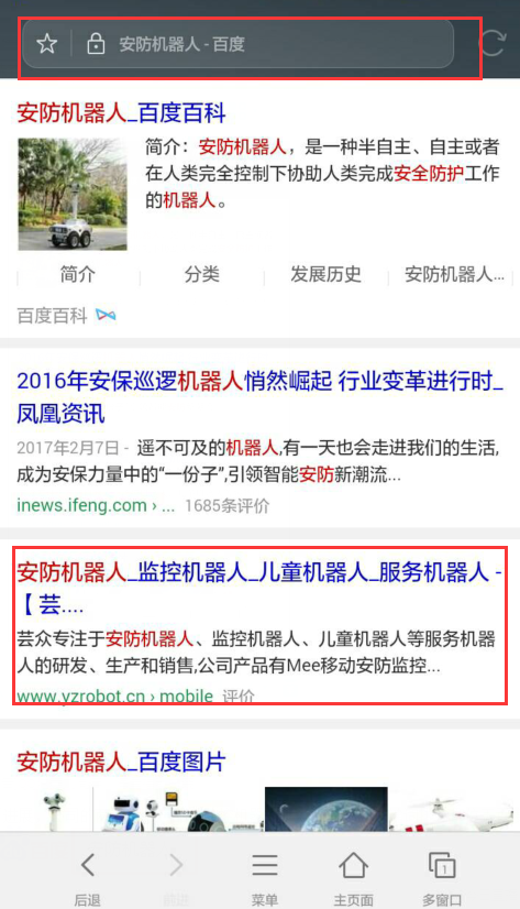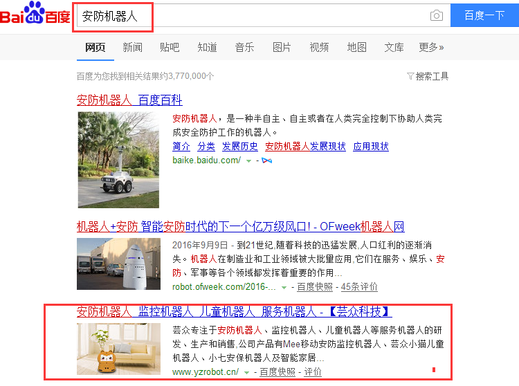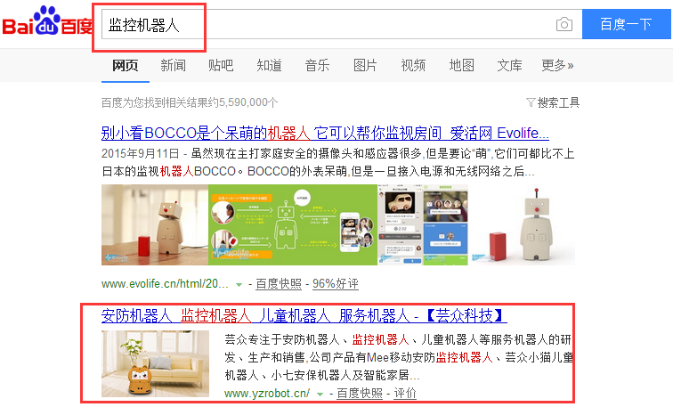 目前芸众的网络推广效果也取得了进展,公司的两大主要产品:监控机器人、安防机器人关键词排名都位于百度及百度移动首页位置。