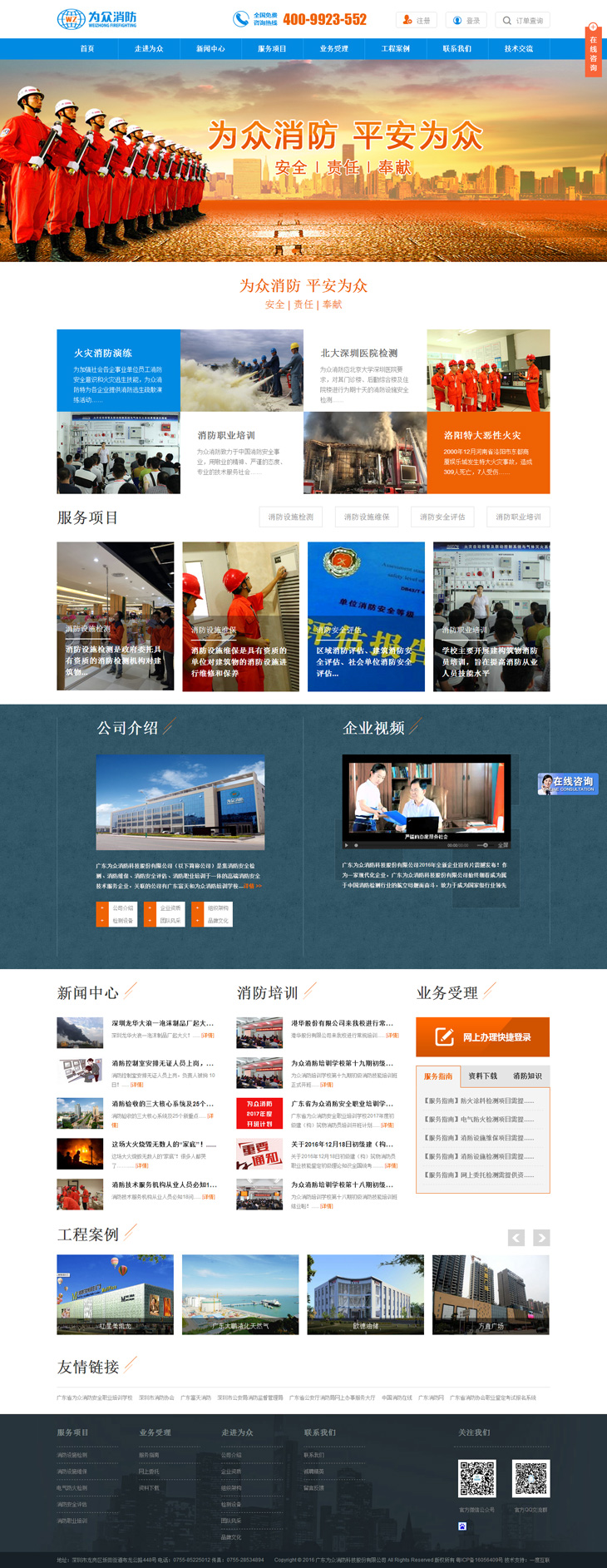 广东省广东为众消防科技股份有限公司(以下简称公司)是集消防安全检测、消防维保、消防安全评估、消防职业培训于一体的高端消防安全技术服务企业,关联的公司有广东富天消防设备检测有限公司和广东省为众消防安全职业培训学校。公司致力于中国消防安全事业,用敬业的精神、严谨的态度、专业的技术服务社会。