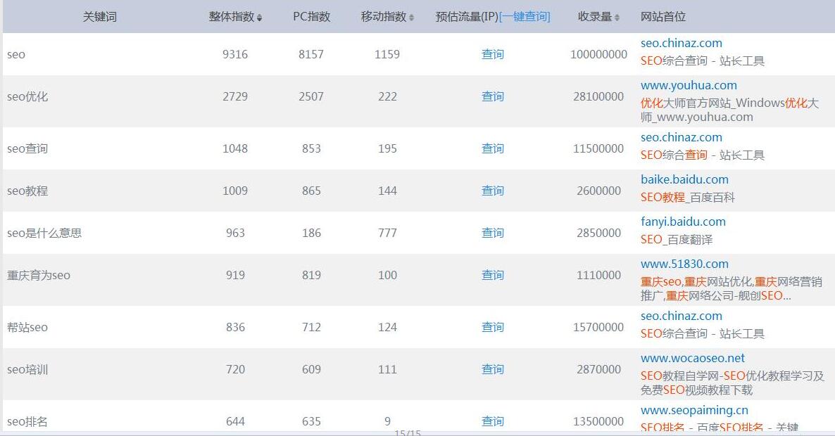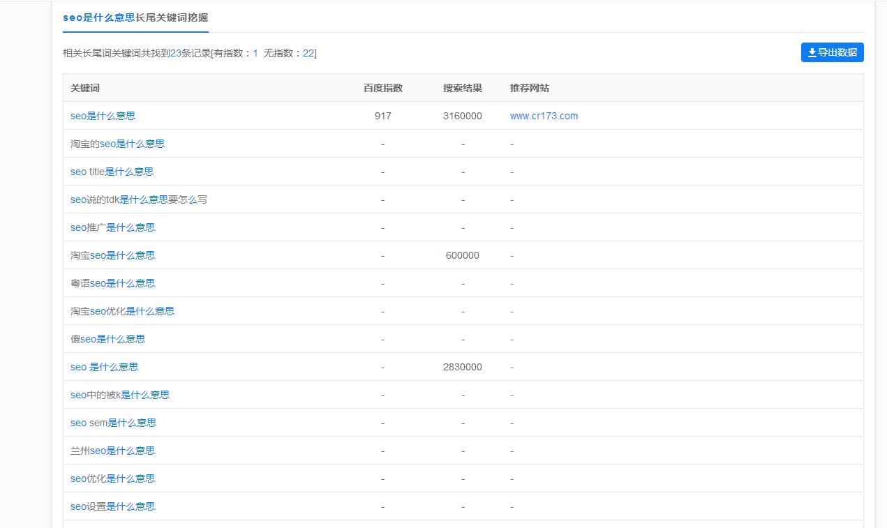 站长或爱站关键词挖掘方法我相信很多朋友都比较熟悉,在这一度小编就不啰嗦太多了,就直接举例子了。比如要做seo这个词的挖掘,在站长工具库直接搜seo就会出现很多关于SEO的词,如seo教程,seo查询,SEO是什么意思等等,这些词我们还可以进行第二次挖掘比较长尾精准的关键词,越精准的长尾词对企业网站来说带来的用户也越精准,网站的排名也比较靠前。