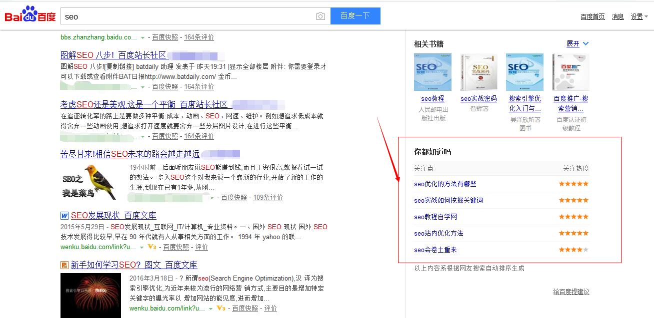 我们在搜索某些关键词的时候,也会有看到排名比较靠前的百度文库文章。比如搜seo这个词,排在前面的有新手如何学习seo,如何做seo,SEO基础知识大全等等的关键词,如果查找某个关键词,出现在首页的比较多是百度文库,这证明用户需要比较详细的资料,我们也可以通过用户的需要加上出现的关键词去编写相关的文章。